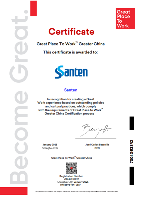 近日,参天公司荣获Great Place to Work(卓越职场)Certification™认证!